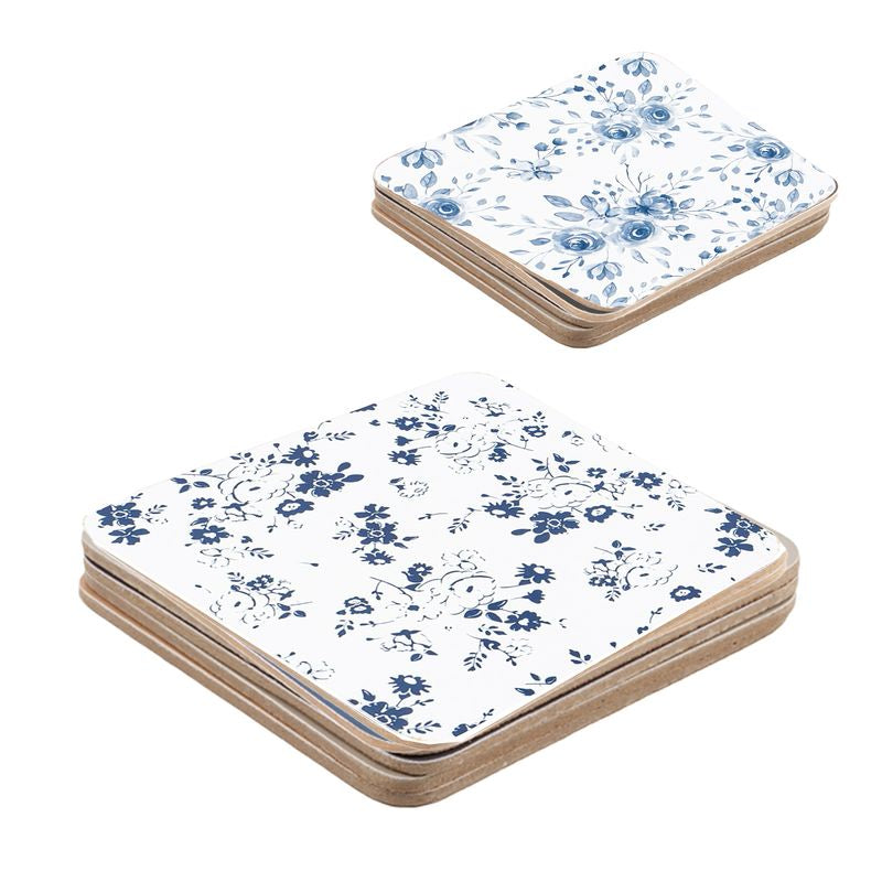 JUEGO 4 POSAVASOS BASE CORCHO FLORES AZUL